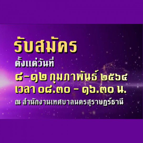 - วันรับสมัคร ๘ - ๑๒ กุมภาพันธ์ ๒๕๖๔ เวลา ๐๘.๓๐-๑๖.๓๐ น. ณ สำนักงานเทศบาลนครสุราษฎร์ธานี