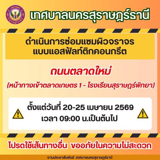 เทศบาลนครสุราษฎร์ธานี จะดำเนินการซ่อมแซมผิวจราจร บริเวณถนนดังต่อไปนี้