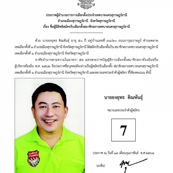 • บัญชีรายชื่อผู้สมัครรับเลือกตั้งสมาชิกสภาเทศบาลนครสุราษฎร์ธานี ที่ได้รับสมัครรับเลือกตั้งและไม่ได้รับเลือกตั้ง เขตเลือกตั้งที่ ๑ (ประกาศผู้อำนวยการการเลือกตั้งประจำเทศบาลนครสุราษฎร์ธานี อำเภอเมืองสุราษฎร์ธานี จังหวัดสุราษฎร์ธานี)