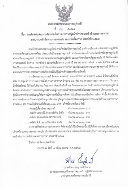 เรื่อง การไม่สนับสนุนงบประมาณในการประกวดพุ่มผ้าป่าประเภทชิงถ้วยพระราชทานฯ งานประเพณีชักพระ - ทอดผ้าป่า และแข่งเรือยาวฯ ประจำปี 2568