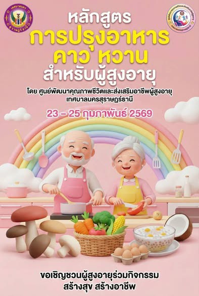 เชิญชวนผู้สูงอายุเข้าร่วมกิจกรรม "การปรุงอาหารคาว หวาน สำหรับผู้สูงอายุ" วันที่ 23 - 25 กุมภาพันธ์ 2569 ณ ศูนย์พัฒนาคุณภาพชีวิตและส่งเสริมอาชีพผู้สูงอายุเทศบาลนครสุราษฎร์ธานี