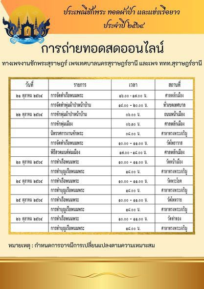 นอกจากนี้ท่านยังสามารถรับชมการถ่ายทอดสดออนไลน์ได้ทาง #เพจงานชักพระสุราษฎร์ #เพจเทศบาลนครสุราษฎร์ธานี และเพจททท.สุราษฎร์ธานี ตามกำหนดการที่แนบ