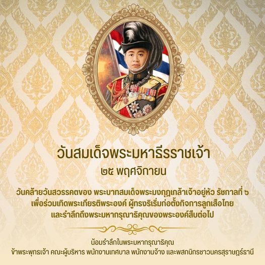 วันที่ 25 พฤศจิกายน ถือเป็นวันคล้ายวันสวรรคตของพระบาทสมเด็จพระมงกุฎเกล้าเจ้าอยู่หัว รัชกาลที่ 6 เพื่อน้อมรำลึกในพระมหากรุณาธิคุณที่ทรงประกอบพระราชกรณียกิจที่เป็นประโยชน์อย่างมากมายมหาศาลต่อประเทศชาติ ทั้งในด้านการคมนาคม การปกครอง การก่อตั้งกิจการเสือป่าและลูกเสือ รวมทั้งด้านศิลปวัฒนธรรม และด้านวรรณคดี รัฐบาลจึงกำหนดให้วันที่ 25 พฤศจิกายนของทุกปี เป็น ”วันสมเด็จพระมหาธีรราชเจ้า” เพื่อเทิดพระเกียรติและรำลึกถึงพระมหากรุณาธิคุณของพระองค์ท่านสืบไป
