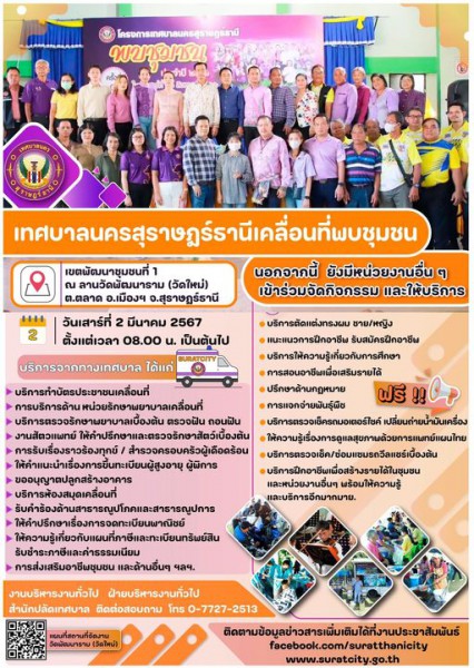 เทศบาลนครสุราษฎร์ธานีเชิญชวนพี่น้องประชาชน ร่วมกิจกรรม "เทศบาลนครสุราษฎร์ธานีเคลื่อนที่พบชุมชน" เพื่อให้บริการขั้นพื้นฐานเชิงรุกแก่ชุมชน บริการให้ความรู้ ข้อมูลต่างๆ การสร้างงานสร้างรายได้ให้แก่ชุมชน ตลอดจนรับฟังความคิดเห็นรับทราบปัญหาของชุมชน