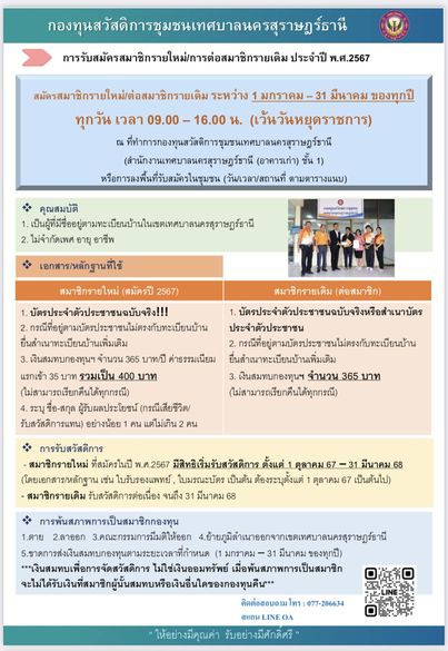 วันอังคารที่ 27 กุมภาพันธ์ 2567 เทศบาลนครสุราษฎร์ธานี ลงพื้นที่รับสมัครสมาชิกกองทุนสวัสดิการชุมชนเทศบาลนครสุราษฎร์ธานี และต่ออายุสมาชิกรายเก่า ณ ที่ทำการชุมชนหน้าสนามกีฬา (บริเวณไก่น้ำคาร์แคร์) ตั้งแต่เวลา 09.00 - 16.00 น.
