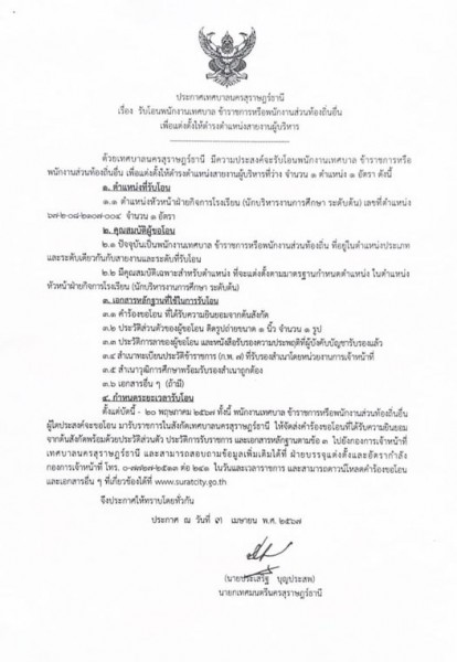 เพื่อแต่งตั้งให้ดำรงตำแหน่งสายงานผู้บริหาร สังกัดเทศบาลนครสุราษฎร์ธานี ตำแหน่งหัวหน้าฝ่ายกิจการโรงเรียน (นักบริหารงานการศึกษา ระดับต้น) จำนวน 1 อัตรา โดยกำหนดระยะเวลารับโอน ตั้งแต่บัดนี้ - 20 พฤษภาคม 2567