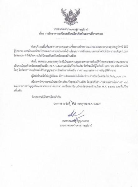 ดังนั้น เทศบาลนครสุราษฎร์ธานีเป็นเขตควบคุมตามพระราชบัญญัติรักษาความสะอาดและความเป็นระเบียบเรียบร้อยของบ้านเมือง พ.ศ. ๒๕๓๕ และที่แก้ไขเพิ่มเติม