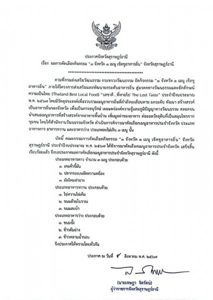 ประกาศจังหวัดสุราษฎร์ธานี เรื่อง ผลการคัดเลือกกิจกรรม "๑ จังหวัด ๑ เมนู เชิดชูอาหารถิ่น" จังหวัดสุราษฎร์ธานี