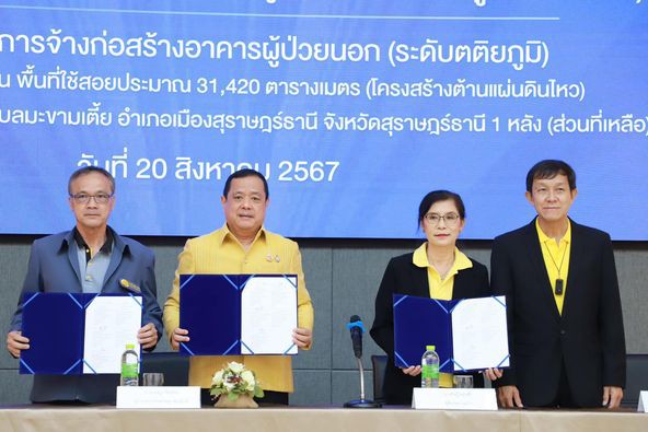 (โครงสร้างต้านแผ่นดินไหว) โรงพยาบาลสุราษฎร์ธานี ตำบลมะขามเตี้ย อำเภอเมืองสุราษฎร์ธานี จังหวัดสุราษฎร์ธานี 1 หลัง (ส่วนที่เหลือ) โดยมีนายเจษฎา จิตรัตน์ ผู้ว่าราชการจังหวัดสุราษฎร์ธานี เป็นประธานร่วมลงนามในบันทึกข้อตกลง พร้อมด้วยผู้รับจ้าง และผู้สังเกตการณ์ ทั้งนี้มีนางสาวกานสินี โอภาสรังสรรค์ สมาชิกสภาผู้แทนราษฎร เขต 1 จังหวัดสุราษฎร์ธานี นายแพทย์จิรชาติ เรืองวัชรินทร์ นายแพทย์สาธารณสุข นายแพทย์ปณิธาน สื่อมโนธรรม ผู้อำนวยการโรงพยาบาลสุราษฎร์ธานี เจ้าหน้าที่ และสื่อมวลชน ร่วมเป็นสักขีพยาน