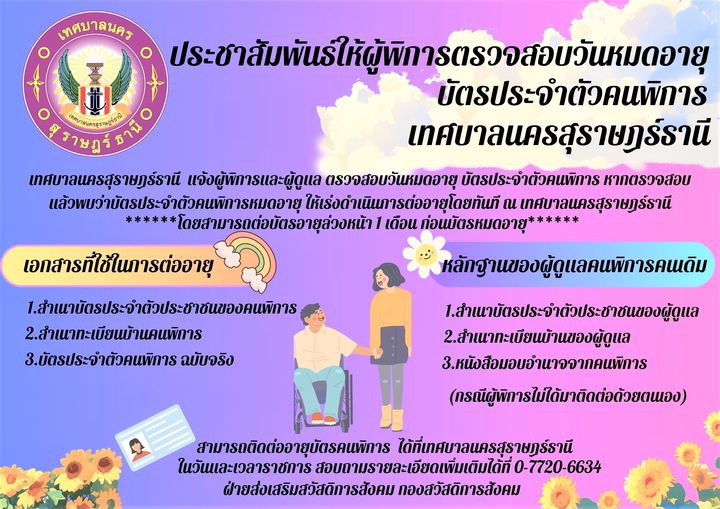 ขอให้ผู้พิการตรวจสอบวันหมดอายุ บัตรประจำตัวคนพิการ หากหมดอายุให้เร่งดำเนินการต่ออายุโดยทันทีเพื่อสิทธิประโยชน์ ทั้งนี้สามารถต่ออายุบัตรล่วงหน้า 1 เดือน ก่อนบัตรหมดอายุ โดยแนบเอกสารที่ใช้ในการต่ออายุ และผู้ดูแลคนพิการคนเดิม (กรณีผู้พิการไม่ได้มาติดต่อด้วยตนเอง) ณ สำนักงานเทศบาลนครสุราษฎร์ธานี ในวันและเวลาราชการ