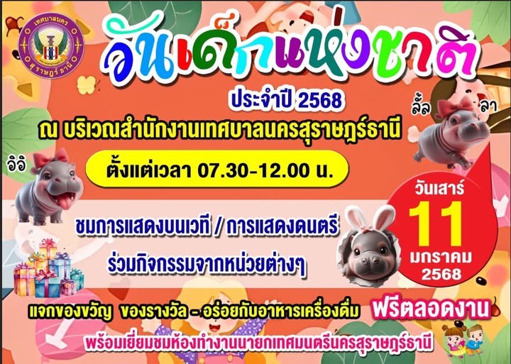 ในวันเสาร์ที่ 11 มกราคม 2568 ณ สนามหน้าสำนักงานเทศบาลนครสุราษฎร์ธานี ตั้งแต่เวลา 07.30 – 12.00 น. ภายในงานมีกิจกรรมการแสดงต่างๆ และของขวัญ ของรางวัลมากมาย พร้อมเยี่ยมชมห้องทำงานนายกเทศมนตรีนครสุราษฎร์ธานี