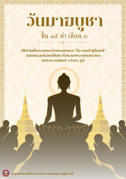 - ขอเชิญชวนพุทธศาสนิกชนทำบุญ ตักบาตร เวียนเทียน หรือปฏิบัติธรรมเพื่อถวายเป็นพุทธบูชา เนื่องในวันมาฆบูชา วันขึ้น 15 ค่ำ เดือน 3 วันที่ 12 กุมภาพันธ์ 2568
