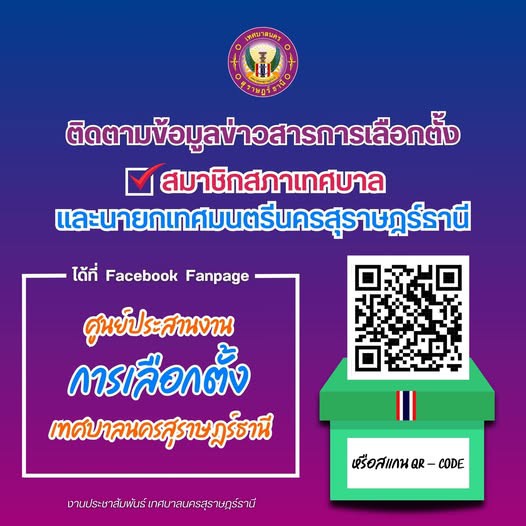 ท่านสามารถติดตามข้อมูลข่าวสารเกี่ยวกับการเลือกตั้งสมาชิกสภาเทศบาลและนายกเทศมนตรีนครสุราษฎร์ธานี ได้ที่ Facebook page : ศูนย์ประสานงาน การเลือกตั้งเทศบาลนครสุราษฎร์ธานี หรือสแกน QR Code