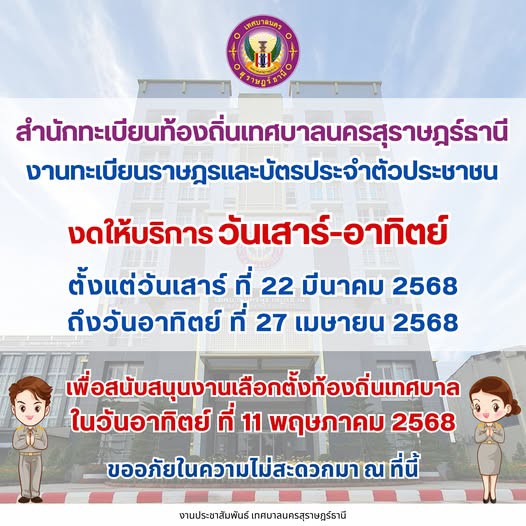 - สำนักทะเบียนท้องถิ่นเทศบาลนครสุราษฎร์ธานี งานทะเบียนราษฎรและบัตรประจำตัวประชาชน งดให้บริการวันเสาร์-อาทิตย์
