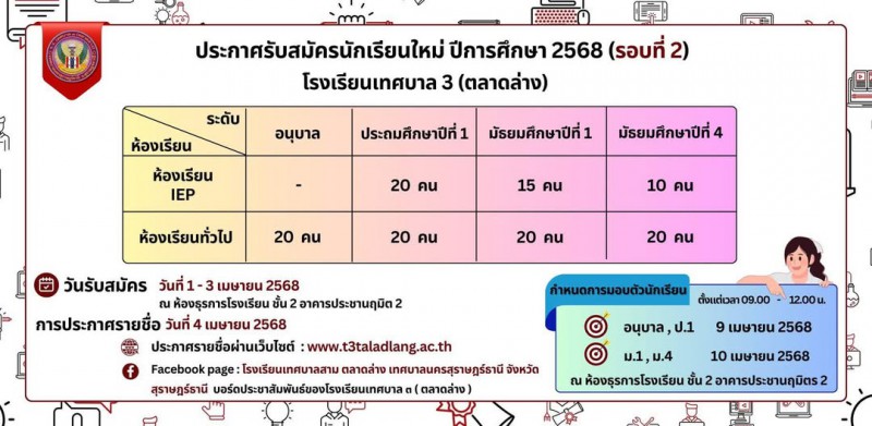 โรงเรียนเทศบาล ๓ (ตลาดล่าง) ประกาศรับสมัครนักเรียนใหม่ ปีการศึกษา 2568 (รอบที่ 2) รับสมัครตั้งแต่วันที่ 1 - 3 เมษายนนี้