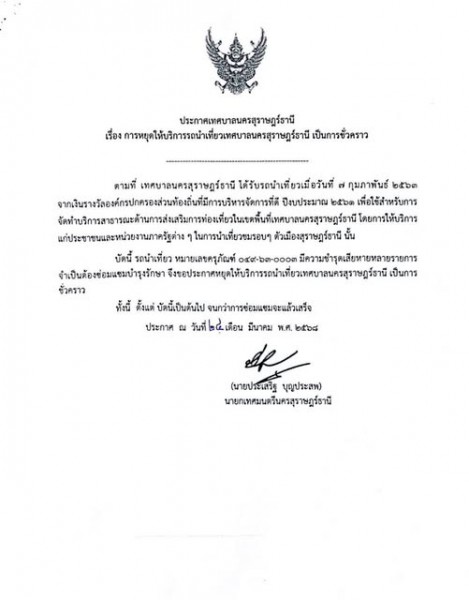 • ประกาศเทศบาลนครสุราษฎร์ธานี เรื่อง การหยุดให้บริการรถนำเที่ยวเทศบาลนครสุราษฎร์ธานี เป็นการชั่วคราว