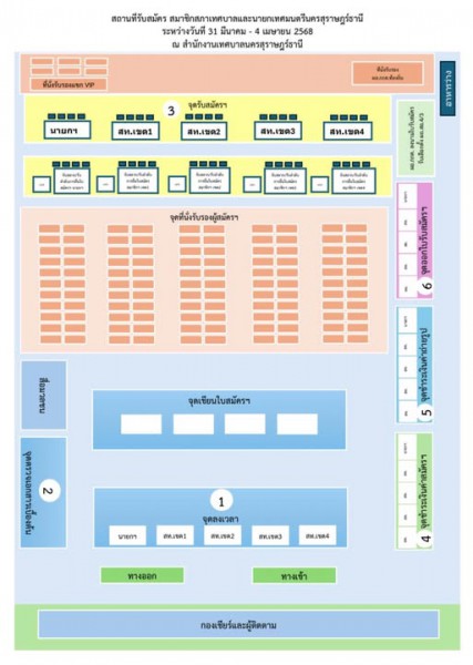 • แผนผัง สถานที่รับสมัครสมาชิกสภาเทศบาลและนายกเทศมนตรีนครสุราษฎร์ธานี ในวันที่ 31 มีนาคม - 4 เมษายน 2568 บริเวณสำนักเทศบาลนครสุราษฎร์ธานี