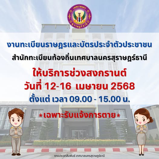 งานทะเบียนราษฎรและบัตรประจำตัวประชาชน สำนักทะเบียนท้องถิ่นเทศบาลนครสุราษฎร์ธานี ให้บริการช่วงสงกรานต์ วันที่ 12-16 เมษายน 2568 ตั้งแต่เวลา 09.00 - 15