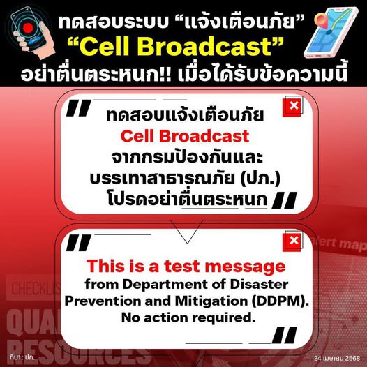 กรมป้องกันและบรรเทาสาธารณภัย เตรียมทดสอบระบบแจ้งเตือนภัยพิบัติผ่าน Cell Broadcast โดยการแจ้งเตือนดังกล่าวจะส่งสัญญาณไปยังโทรศัพท์มือถือที่อยู่ในพื้นที่ทดสอบทั้งรูปแบบของเสียงและข้อความว่า "ทดสอบแจ้งเตือนภัย Cell Broadcast จากกรมป้องกันและบรรเทาสาธารณภัย (ปภ.) โปรดอย่าตื่นตระหนก" จึงขอประชาสัมพันธ์ให้ผู้ที่อยู่ในพื้นที่ทดสอบทราบช่วงเวลาที่จะดำเนินการทดสอบ เพื่อป้องกันความสับสนที่จะเกิดขึ้น
