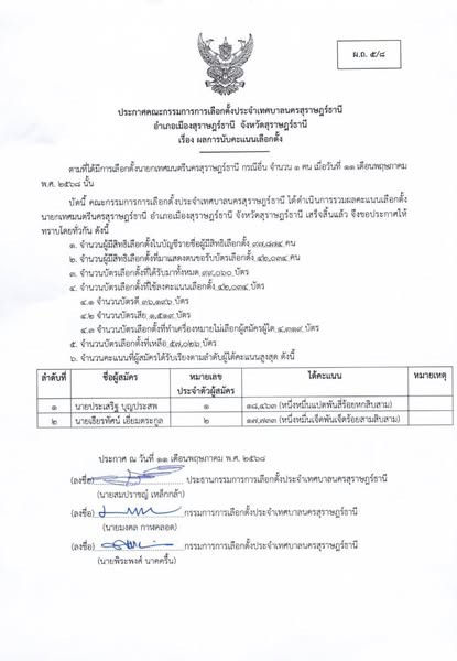 ประกาศคณะกรรมการการเลือกตั้งประจำเทศบาลนครสุราษฎร์ธานี อำเภอเมืองสุราษฎร์ จังหวัดสุราษฎร์ธานี ธานี เรื่อง ผลการนับคะแนนเลือกตั้ง