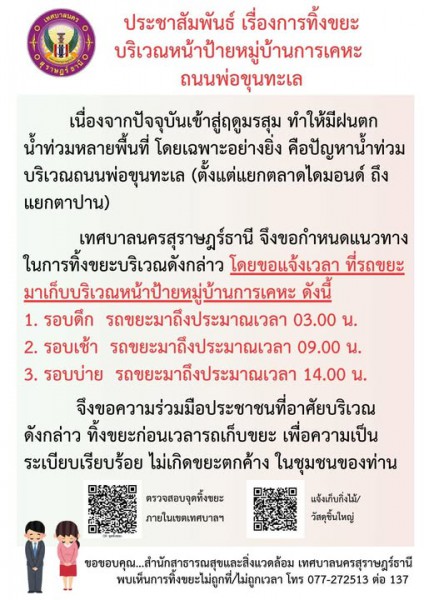 เนื่องจากปัจจุบันเข้าสู่ถดูมรสุม ทำให้มีฝนตกน้ำท่วมหลายพื้นที่ โดยเฉพาะอย่างยิ่ง คือปัญหาน้ำท่วมบริเวณถนนพ่อขุนทะเล (ตั้งแต่แยกตลาดไดมอนด์ ถึงแยกตาปาน) เทศบาลนครสุราษฎร์ธานี จึงขอกำหนดแนวทางในการทิ้งขยะบริเวณดังกล่าว โดยขอแจ้งเวลา ที่รถขยะมาเก็บบริเวณหน้าป้ายหมู่บ้านการเคหะ ดังนี้