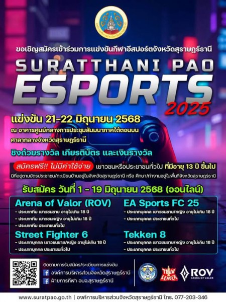 • ข่าวประชาสัมพันธ์ ขอเชิญสมัครเข้าร่วมการแข่งขันกีฬาอีสปอร์ตจังหวัดสุราษฎร์ธานี “Suratthani PAO Esports 2025”