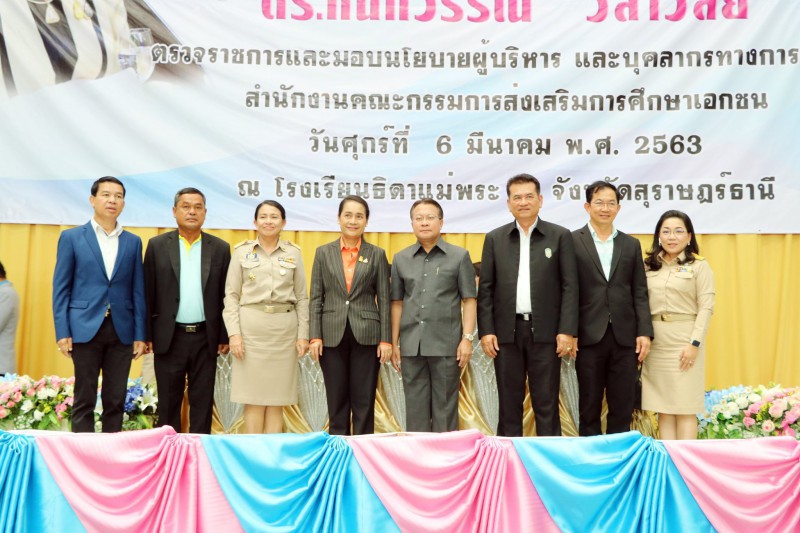 โดยมีนางแจ่มจิตร์ พูลสวัสดิ์ รองผู้ว่าราชการจังหวัดสุราษฎร์ธานี เป็นผู้กล่าวต้อนรับ เพื่อตรวจราชการและมอบนโยบายผู้บริหารและบุคลากรทางการศึกษาให้เป็นไปตามระเบียบบริหารราชการกระทรวงศึกษาธิการ พ.ศ.2546 และตรวจราชการ ติดตาม ตรวจสอบ ประเมินนิเทศการศึกษาของกระทรวงศึกษาธิการ ทั้งนี้ยังมีคณะผู้บริหารแต่ละโรงเรียน คณะครู หน่วยงานภาครัฐ และเจ้าหน้าที่เข้าร่วมให้การต้องรับ ณ อาคารดวงหทัย โรงเรียนธิดาแม่พระ จังหวัดสุราษฎร์ธานี
