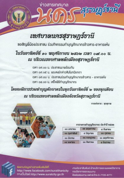 เทศบาลนครสุราษฎร์ธานี ขอเชิญชวนพุทธศาสนิกชน ร่วมกิจกรรมพิธีทำบุญตักบาตรข้าวสาร-อาหารแห้งที่จัดขึ้นทุกวันอาทิตย์ที่ 2 ของเดือน ร่วมบุญ “ปูเสื่อ ตักบาตร วิถีไทย วิถีพุทธ เมืองคนดี”