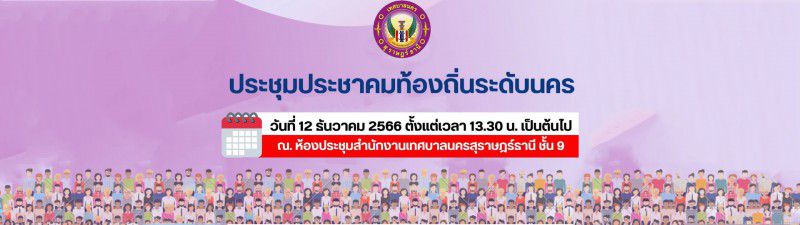 ประชุมประชาคมท้องถิ่น วันที่ 12 ธันวาคม 2566 ตั้งแต่เวลา 13.30 น. เป็นต้นไป ณ ห้องประชุมสำนักงานเทศบาลนครสุราษฎร์ธานี ชั้น 9