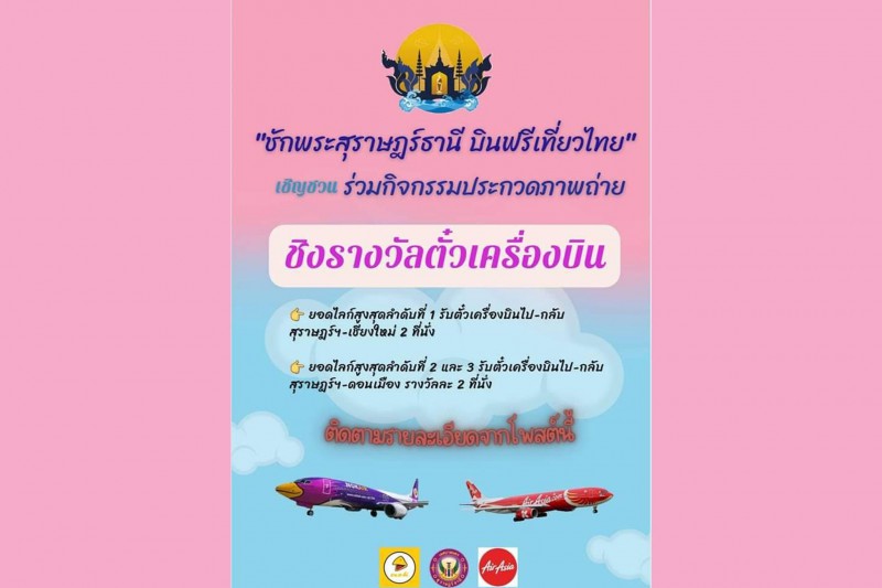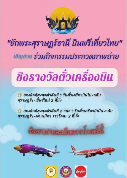 เทศบาลนครสุราษฎร์ธานี ร่วมกับสายการบินแอร์เอเชีย และสายการบินนกแอร์ ขอเชิญร่วมกิจกรรม ประกวดภาพถ่าย "ชักพระสุราษฎร์ธานี บินฟรีเที่ยวไทย"