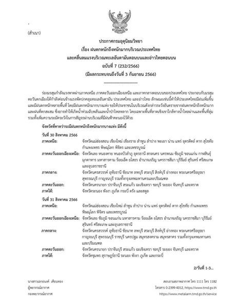 กรมอุตุนิยมวิทยาออก ประกาศเรื่อง “ฝนตกหนักถึงหนักมากบริเวณประเทศไทย และคลื่นลมแรงบริเวณทะเลอันดามันตอนบนและอ่าวไทยตอนบน” ฉบับที่ 7 มีผลกระทบตั้งแต่วันที่ 30 สิงหาคม 2566 จนถึงวันที่ 3 กันยายน 2566 ร่องมรสุมกำลังแรงพาดผ่านภาคเหนือ ภาคตะวันออกเฉียงเหนือ และภาคกลางตอนบนของประเทศไทย ประกอบกับมรสุมตะวันตกเฉียงใต้กำลังค่อนข้างแรงพัดปกคลุมทะเลอันดามัน และอ่าวไทย