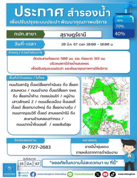 ขออภัยในความไม่สะดวกมา ณ โอกาสนี้ สอบถามข้อมูลเพิ่มเติม กปภ.สาขาสุราษฎร์ธานี(พ) โทร.0-7727-2683 หรือ PWA Contact Center โทร. 1662