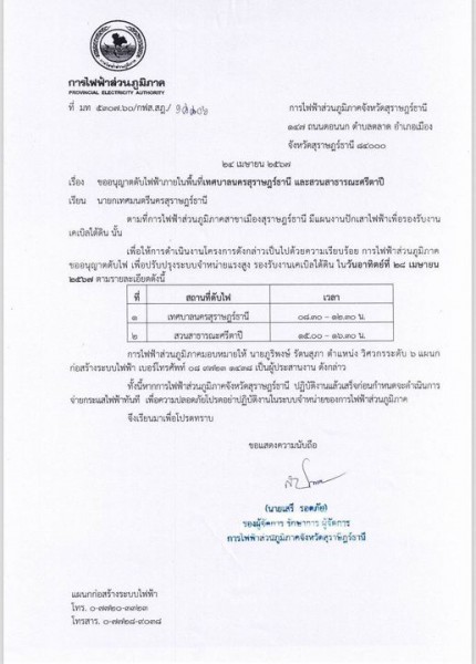 ทั้งนี้หากการไฟฟ้าส่วนภูมิภาคจังหวัดสุราษฎร์ธานี ปฏิบัติงานแล้วเสร็จก่อนกำหนดจะดำเนินการจ่ายกระแสไฟฟ้าทันที เพื่อความปลอดภัยโปรดอย่าปฏิบัติงานในระบบจำหน่ายของการไฟฟ้าส่วนภูมิภาค