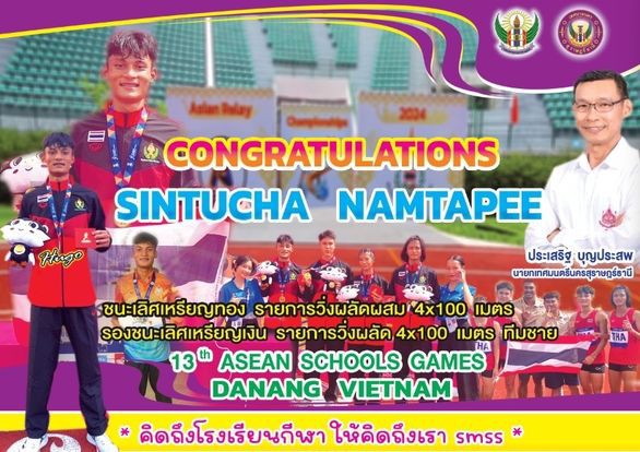 เทศบาลนครสุราษฎร์ธานี ขอแสดงความยินดีกับนายสินธุชา นามตาปี นักเรียนโรงเรียนกีฬาเทศบาลนครสุราษฎร์ธานี ได้รับรางวัลชนะเลิศ คว้าเหรียญทอง รายการวิ่งผลัด 4x100 เมตร และ รางวัลรองชนะเลิศ เหรียญเงิน รายการวิ่งผลัด 4x100 เมตร ทีมชาย ในการแข่งขันกีฬาโรงเรียนแห่งอาเซียน ครั้งที่ 13 (13th ASEAN School Games) จัดขึ้นระหว่างวันที่ 1-9 มิถุนายน 2567 ณ สนาม Hoa xuan stadium เมืองดานัง ประเทศเวียดนาม