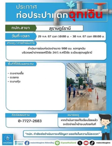 สอบถามข้อมูลเพิ่มเติม กปภ.สาขาสุราษฎร์ธานี(พ) โทร.0-7727-2683 หรือ PWA Contact Center โทร.1662