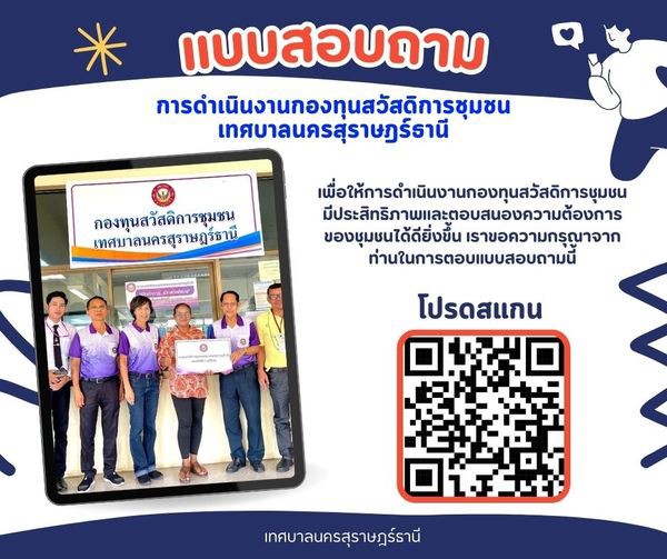 • ขอเชิญร่วมตอบแบบสอบถาม การดำเนินงานกองทุนสวัสดิการชุมชนเทศบาลนครสุราษฎร์ธานี