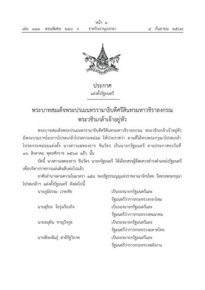 พระบาทสมเด็จพระปรเมนทรรามาธิบดีศรีสินทรมหาวชิราลงกรณ พระวชิรเกล้าเจ้าอยู่หัว มีพระบรมราชโองการโปรดเกล้าฯ ให้ประกาศว่า ตามที่ได้ทรงพระกรุณาโปรดเกล้า ฯ แต่งตั้ง น.ส.แพทองธาร ชินวัตร เป็นนายกรัฐมนตรี ตามประกาศลงวันที่ 16 ส.ค. 2567 แล้ว นั้น
