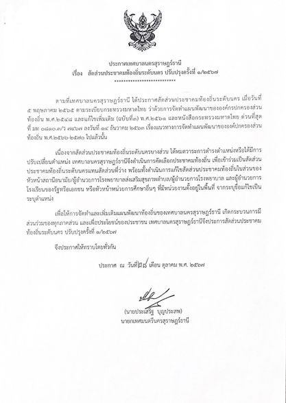 เพื่อให้การจัดทำและเพิ่มเติมแผนพัฒนาท้องถิ่นของเทศบาลนครสุราษฎร์ธานี เกิดกระบวนการมีส่วนร่วมของทุกภาคส่วน และเพื่อประโยชน์ของประชาชน เทศบาลนครสุราษฎร์ธานีจึงประกาศสัดส่วนประชาคมท้องถิ่นระดับนคร ปรับปรุงครั้งที่ ๑/๒๕๖๗