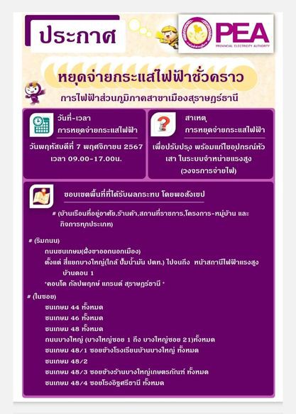 การไฟฟ้าส่วนภูมิภาคสาขาเมืองสุราษฎร์ธานี มีความจำเป็นต้องงดจ่ายกระแสไฟฟ้า เป็นการชั่วคราว เพื่อปรับปรุง พร้อมแก้ไขอุปกรณ์หัวเสา ในระบบจำหน่ายแรงสูง (วงจรการจ่ายไฟ) ในวันพฤหัสบดีที่ 7 พฤศจิกายน 2567 ตั้งแต่เวลา 09.00 - 17.00 น.