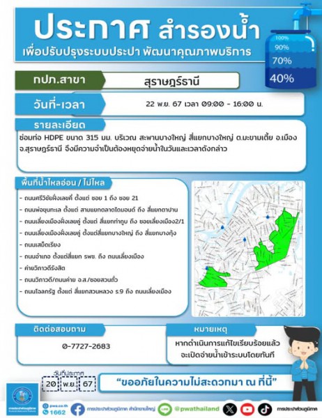 ประกาศสำรองน้ำประปาชั่วคราว ในวันศุกร์ที่ 22 พฤศจิกายน 2567 เวลา 09.00 - 16.00 น. หรือจนกว่าน้ำจะเต็มระบบ เพื่อดำเนินการซ่อมท่อ HDPE ขนาด 315 มม. บริเวณสะพานบางใหญ่ สี่แยกบางใหญ่ ต.มะขามเตี้ย อ.เมือง จ.สุราษฎร์ธานี