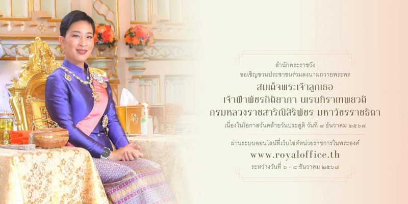 สำนักพระราชวัง ขอเชิญชวนประชาชนร่วมลงนามถวายพระพร สมเด็จพระเจ้าลูกเธอ เจ้าฟ้าพัชรกิติยาภา นเรนทิราเทพยวดี กรมหลวงราชสาริณีสิริพัชร มหาวัชรราชธิดา เนื่องในโอกาสวันคล้ายวันประสูติ วันที่ 7 ธันวาคม 2567 ผ่านระบบออนไลน์ ที่เว็บไซต์หน่วยราชการในพระองค์ www.royaloffice.th ระหว่างวันที่ 6 - 8 ธันวาคม 2567