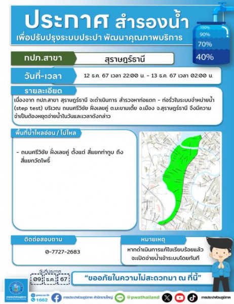 ในวันพฤหัสบดีที่ 12 ธันวาคม 2567 เวลา 22.00 - 02.00 น. ของวันศุกร์ที่ 13 ธันวาคม 2567 หรือจนกว่าน้ำจะเต็มระบบ ในพื้นที่ ถนนศรีวิชัย ฝั่งเลขคู่ ต.มะขามเตี้ย อ.เมือง จ.สุราษฎร์ธานี เพื่อดำเนินการทำ Step Test ค้นหาท่อรั่วเพื่อแก้ไขปัญหาน้ำไม่ไหล-ไหลอ่อน
