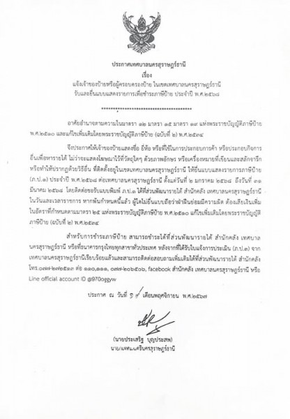 เรื่อง แจ้งเจ้าของป้ายหรือผู้ครอบครองป้าย ในเขตเทศบาลนครสุราษฎร์ธานี รับและยื่นแบบแสดงรายการเพื่อชำระภาษีป้าย ประจำปี พ.ศ.๒๕๖๘