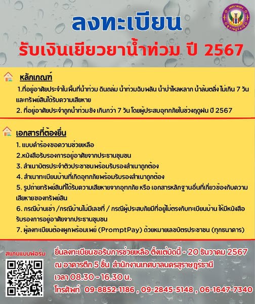 ผู้ประสบอุทกภัยที่มีความประสงค์ขอรับความช่วยเหลือ สามารถมายื่นลงทะเบียน ณ บริเวณชั้น 1 อาคารตึก 5 ชั้น (หลังอาคารสำนักการศึกษาเก่า) สำนักงานเทศบาลนครสุราษฎร์ธานี ถึงวันที่ 20 ธ.ค. 67 เวลา 08.30 - 16.30 น.