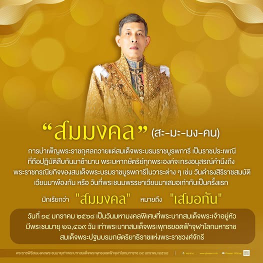- เนื่องในโอกาสพระบาทสมเด็จพระเจ้าอยู่หัวทรงเจริญพระชนมายุ ๒๖,๔๖๙ วัน เป็นสมมงคล พระชนมายุเท่าพระบาทสมเด็จพระพุทธยอดฟ้าจุฬาโลกมหาราช สมเด็จพระปฐมบรมกษัตริยาธิราชแห่งพระราชวงศ์จักรี ๑๔ มกราคม ๒๕๖๘