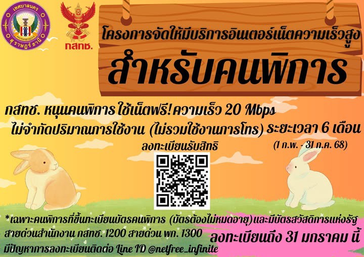 สำนักงาน กสทช. ร่วมกับ กรมส่งเสริมและพัฒนาคุณภาพชีวิตคนพิการ (พก.) จัดทำโครงการจัดให้มีบริการอินเทอร์เน็ตความเร็วสูงสำหรับคนพิการ เพื่อลดความเหลื่อมล้ำในการเข้าถึงเทคโนโลยีและช่วยอำนวยความสะดวกในการดำ ...