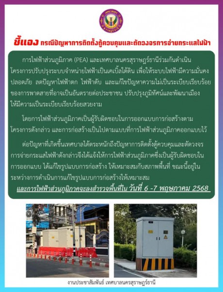 ต่อปัญหาที่เกิดขึ้นเทศบาลได้ตระหนักถึงปัญหาการติดตั้งตู้ควบคุมและตัดวงจรการจ่ายกระแสไฟฟ้าดังกล่าวจึงได้แจ้งให้การไฟฟ้าส่วนภูมิภาคซึ่งเป็นผู้รับผิดชอบในการออกแบบ ได้แก้ไขรูปแบบการก่อสร้าง ให้เหมาะสมกับสภาพพื้นที่ ขณะนี้อยู่ในระหว่างการดำเนินการแก้ไขรูปแบบการก่อสร้างให้เหมาะสม และการไฟฟ้าส่วนภูมิภาค จะลงสำรวจพื้นที่ใน วันที่ 6 -7 พฤษภาคม 2568