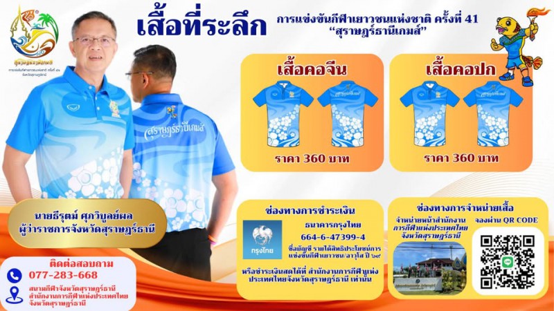 ประชาสัมพันธ์ จังหวัดสุราษฎร์ธานีจัดทำและจำหน่ายเสื้อที่ระลึกการแข่งขันกีฬาเยาวชนแห่งชาติ ครั้งที่ 41 ระดับชาติ "สุราษฎร์ธานีเกมส์"