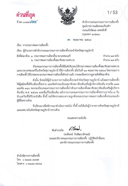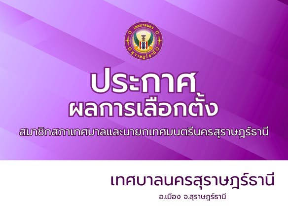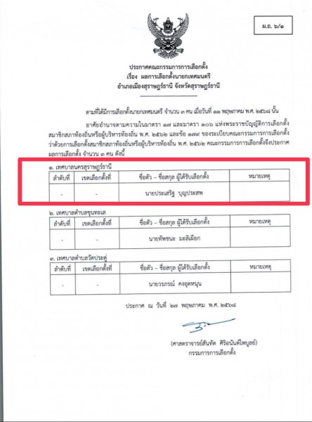 ประกาศคณะกรรมการการเลือกตั้ง เรื่อง ผลการเลือกตั้งนายกเทศมนตรี อำเภอเมืองสุราษฎร์ธานี จังหวัดสุราษฎร์ธานี