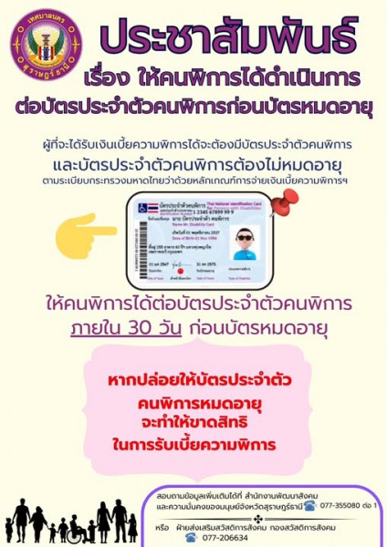 ขอเชิญชวนคนพิการ ดำเนินการต่ออายุบัตรประจำตัวคนพิการ เพื่อป้องกันการเสียสิทธิประโยชน์ของท่าน